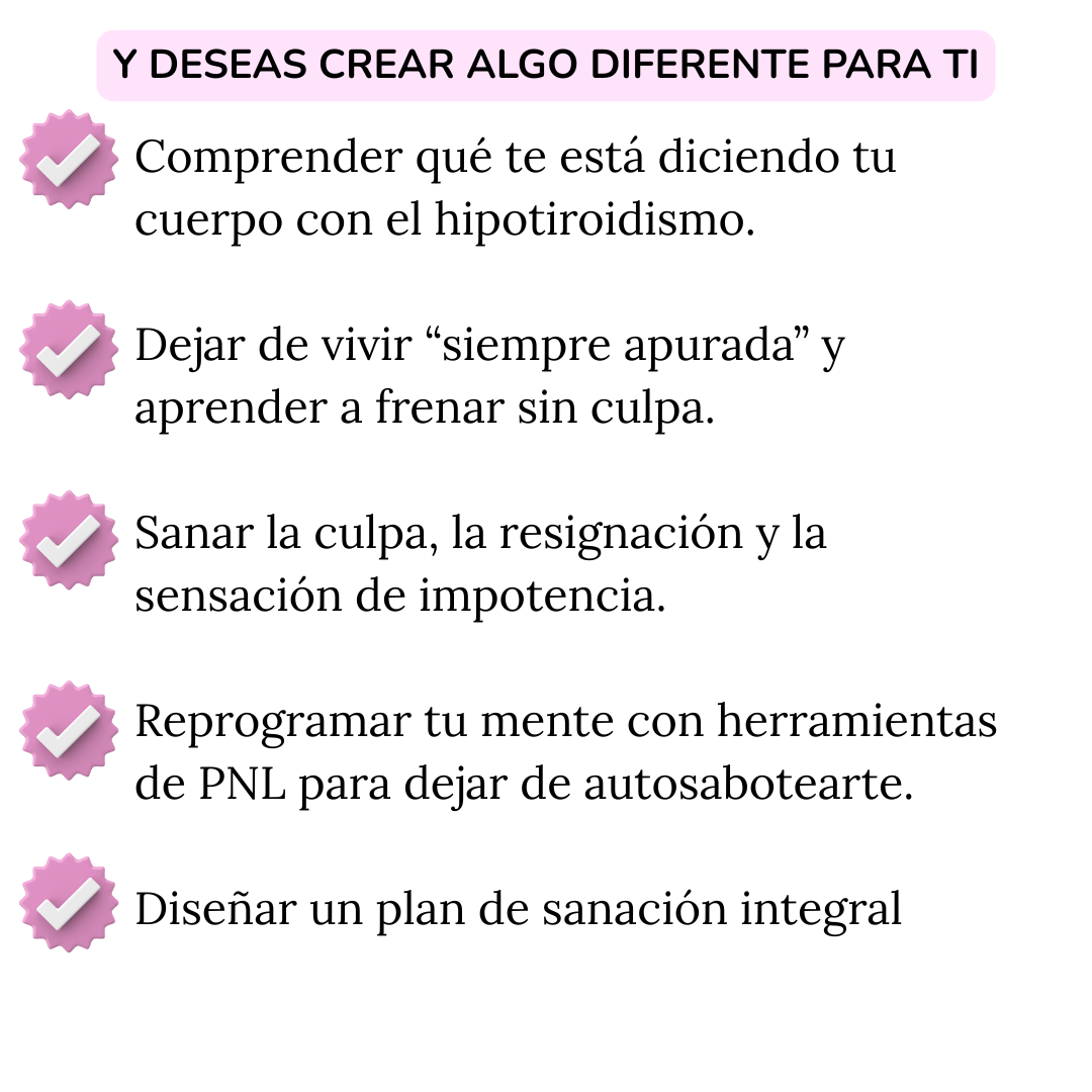 Si bien está enfocado en hipotiroidismo, las herramientas son valiosas para cualquier mujer que sienta fatiga crónica, resignación o que viva en modo "siempre apurada".